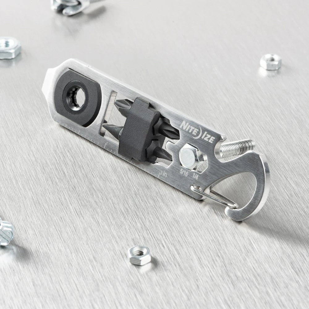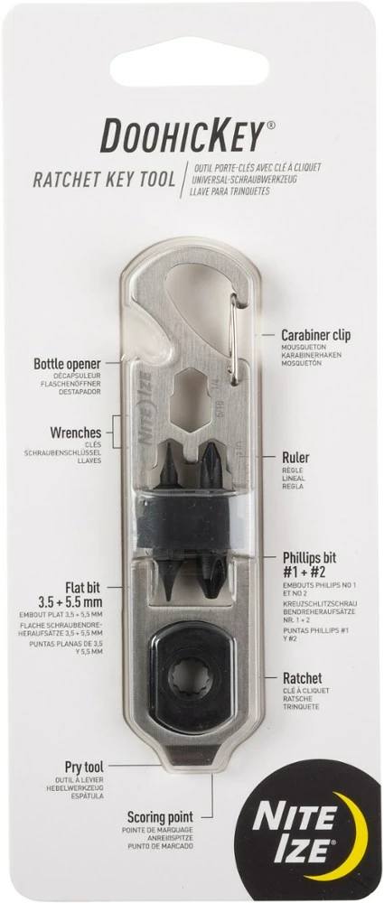 A secret weapon for on-the-go repairs, the Nite Ize DoohicKey Ratchet key tool puts a full-service ratchet, 2 doubled-ended bits and more on your keyring thanks to an included carabiner clip.