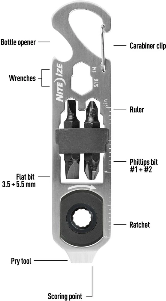 - Includes 2 double-ended bits; a bottle opener; a standard/metric ruler; wrenches; a scoring point for opening boxes; and a pry tool for opening paint cans, screens and more