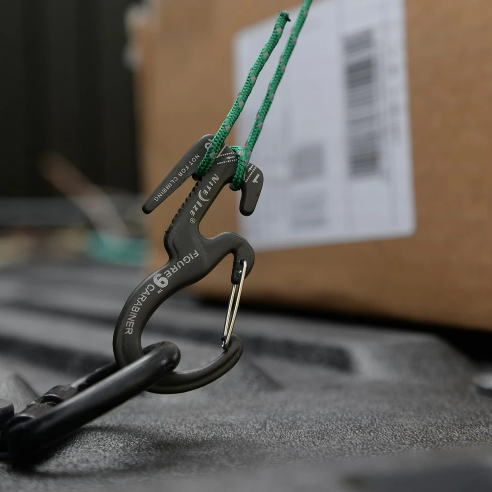 The Carabiner Figure 9 small rope tightener keeps rope tight without knots— the carabiner conveniently clips to fixed points for easy connection.