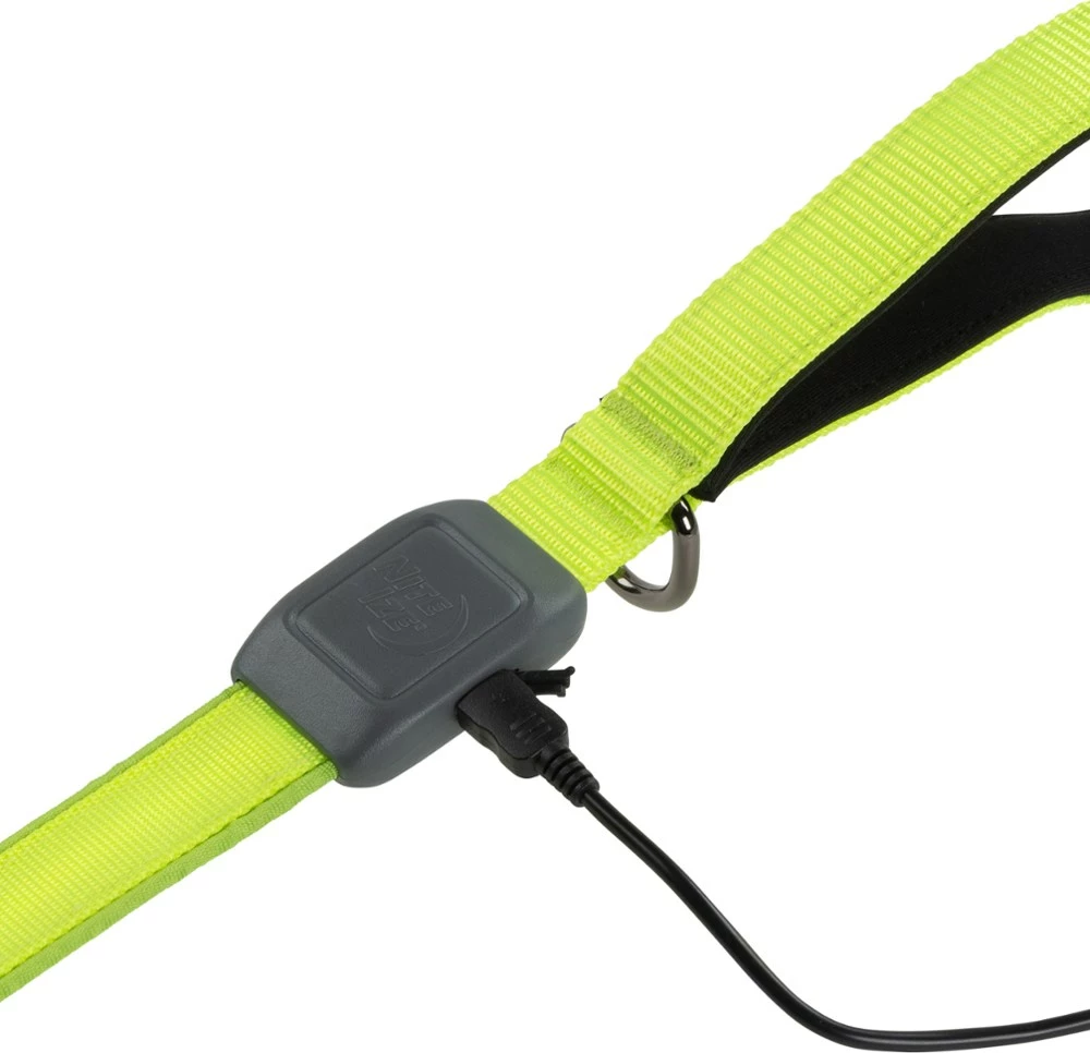 - Ultrabright LEDs send light through an integrated optical fiber, illuminating 48 in. of the leash and offering both constant glow and flash modes; full leash length is 59 in.