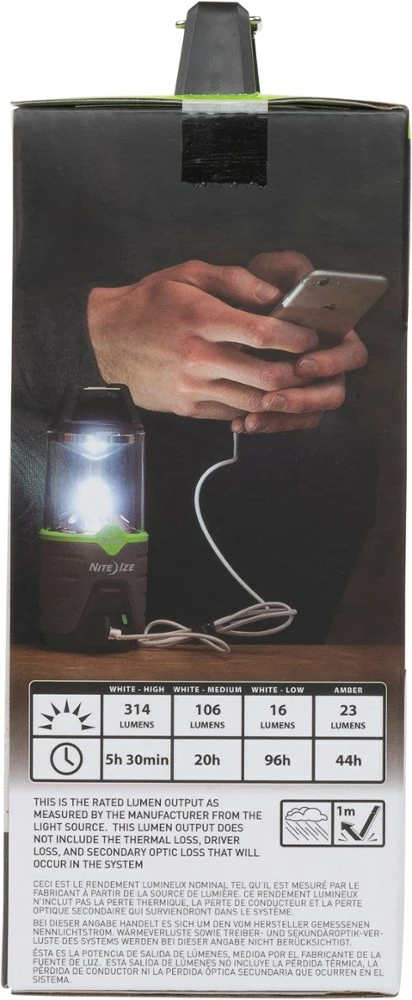 - Features up to 314 lumens of bright white light softened by a built-in light diffuser; lantern can run up to 96 hrs. on a single charge
