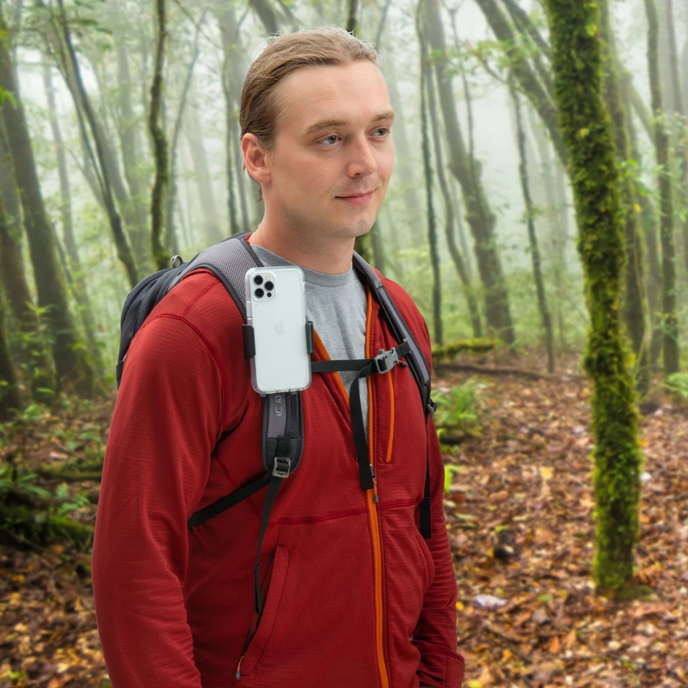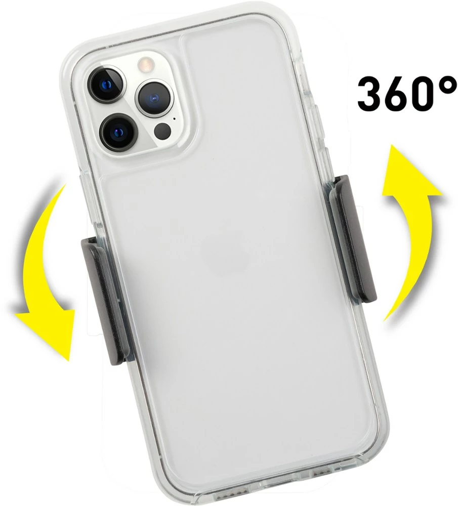 - 360° rotating clip attaches to your backpack strap or belt in landscape or portrait orientation