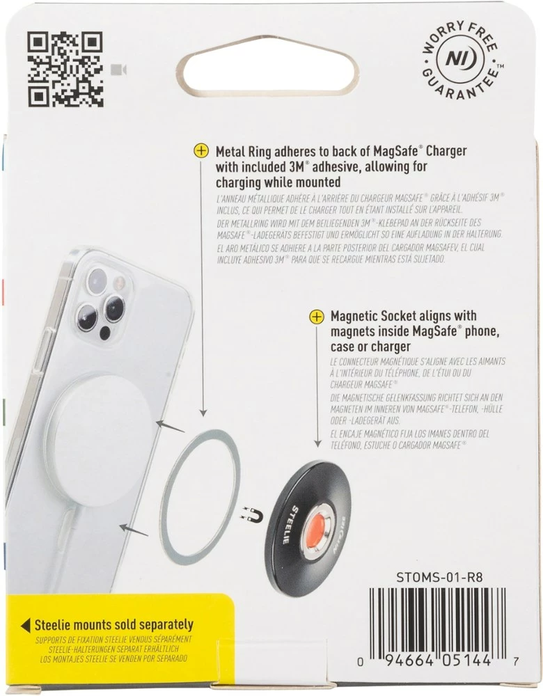 - Metal Ring adheres to the back of a MagSafe charger with included 3M® adhesive, allowing for charging while mounted